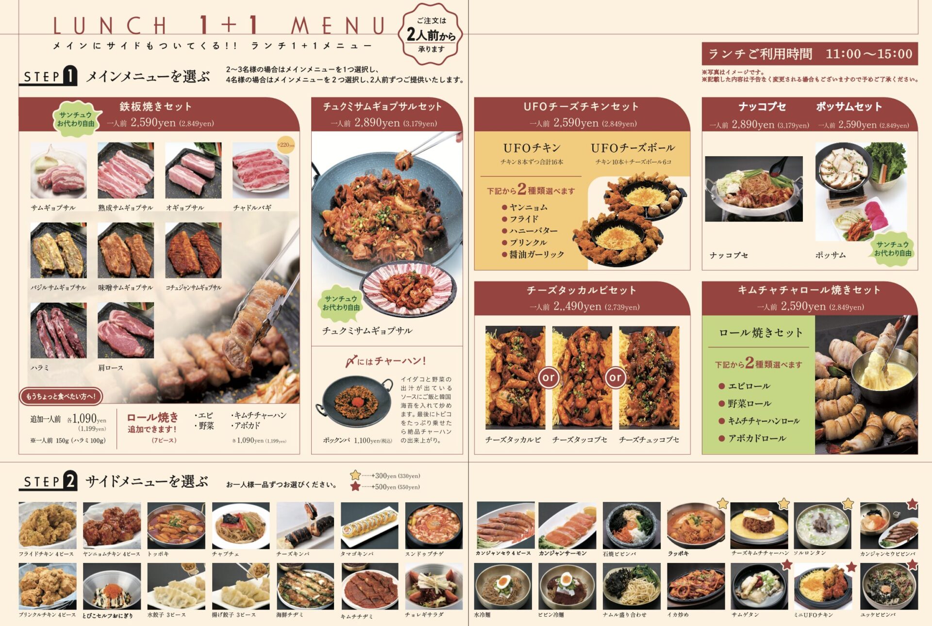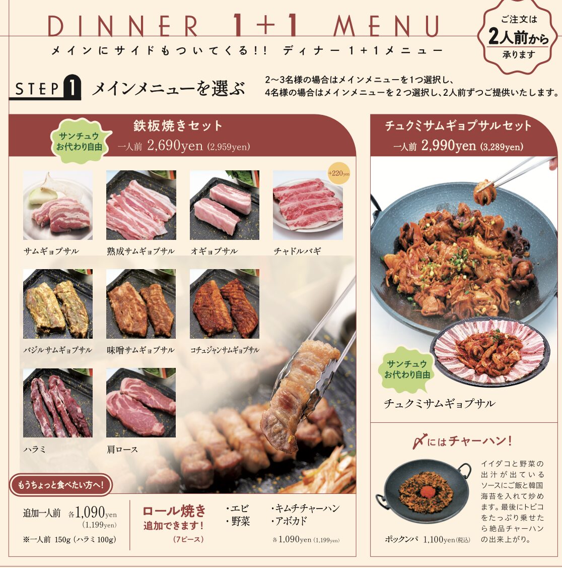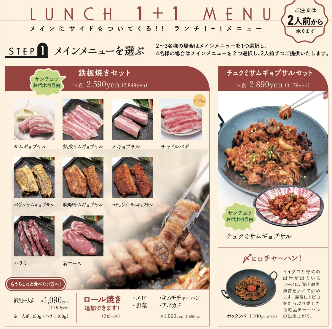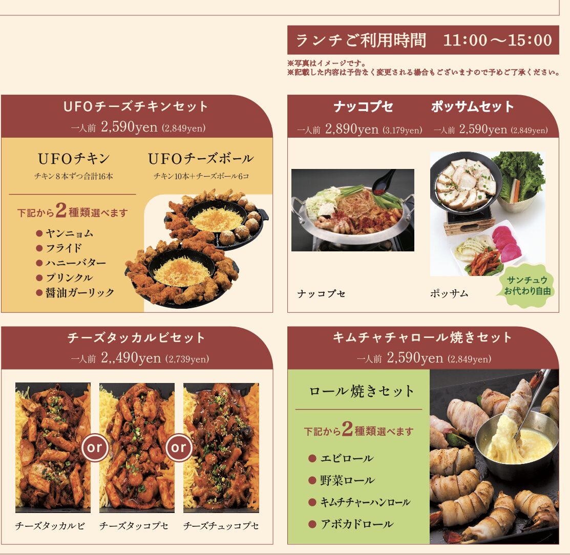 韓国のヘルシープレート甘辛のタッカルビと甘タレで炒めたプルコギ をセットのサンチュウで巻いて美味しくヘルシーにお召し上がりください。